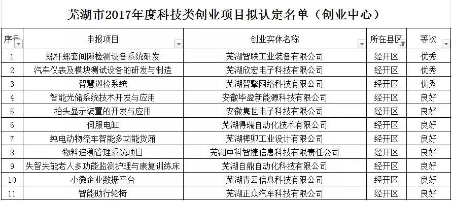 近日,芜湖市创业特区工作领导小组办公室公布了2017年度芜湖市科技类创业项目拟认定名单,创业中心孵化企业11个项目获立项公示,占总数的30%。
